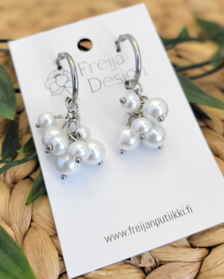 Valkoisia helmiäislasihelmiä ja ruostumatonta terästä. Saranoidun renkaan koko on 18 mm ja helmet voi irroittaa renkaasta, jolloin renkaita voi käyttää erikseen.