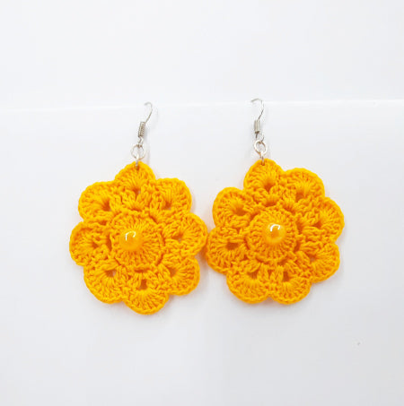 Kevyet, virkatut korvikset, kukan keskellä keltianen