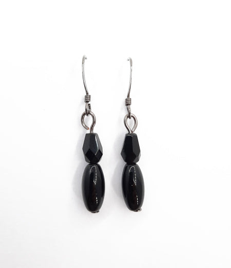Musta pisara ja fasettihiottu helmi, koukut mustaa korumetallia. Riipusosan pituus on 2 cm.