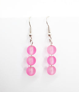 Huurteiset pinkit lasihelmet, hopeoidut koukut. Riipusosan pituus on 3 cm.