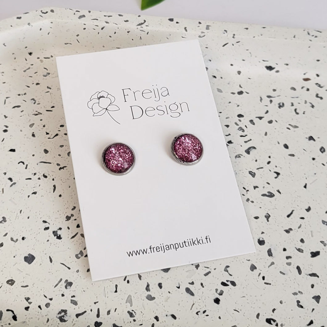 Roosaa ja glitteriä, halkaisija 10 mm. Korupohja ja tausta ovat ruostumatonta terästä, joka on turvallista käyttää herkimmälläkin iholla.