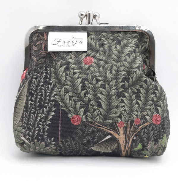 Kaksiosainen kukkaro kuviollista puuvillaa, vuori mustaa puuvillaa. Kukkaron leveys 10-13 cm, korkeus 10 cm ja pohjan leveys 3,5 cm.