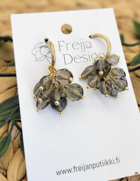 Savun värisiä särmikkäitä lasihelmiä ja kullattua ruostumatonta terästä. Saranoidun renkaan koko on 16 mm ja helmet voi irroittaa renkaasta, jolloin renkaita voi käyttää erikseen.