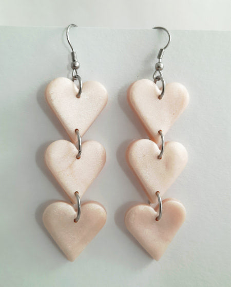 Korvakorut on valmistettu polymeerimassasta ja osat on ruostumatonta terästä. Riipusosan pituus ilman koukkua on 6 cm. Sydämissä on helmiäisen hohdetta ja korvakorut ovat kevyet ja kestävät.